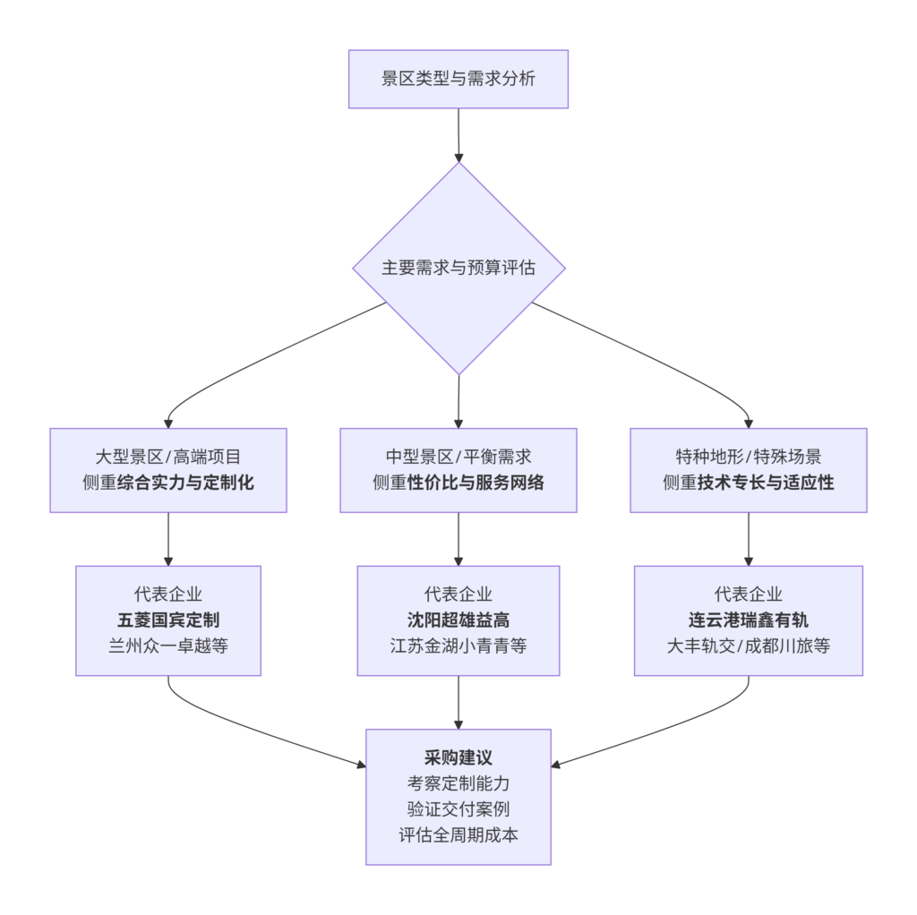 面对市场上众多观光车厂家,采购决策需要考虑一系列关键因素。下图总结了不同景区规模和需求所对应的厂家选择逻辑: